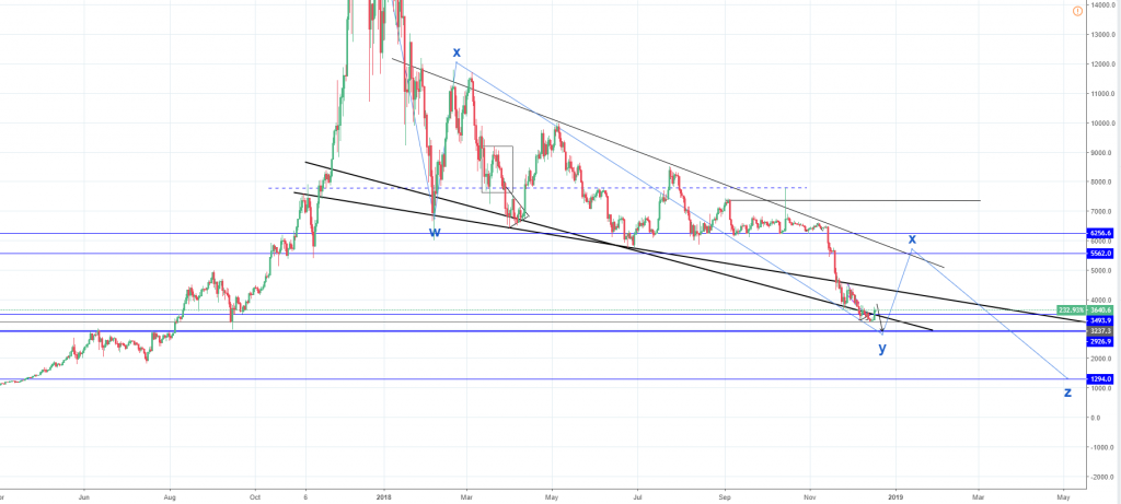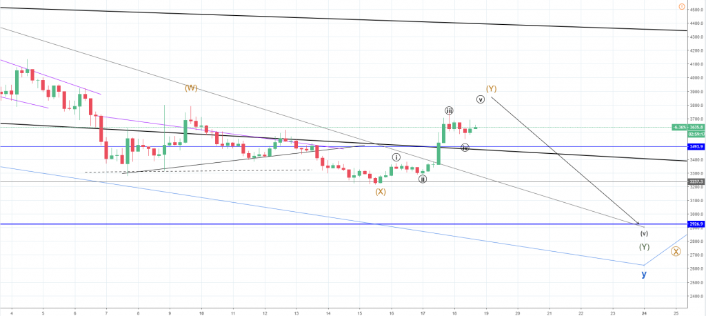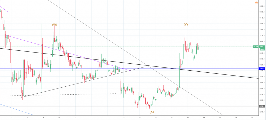 Zooming out to the 4-hour chart you can see that I have encountered this whole move from as a WXY correction and if my count is correct more downside should be expected from here.