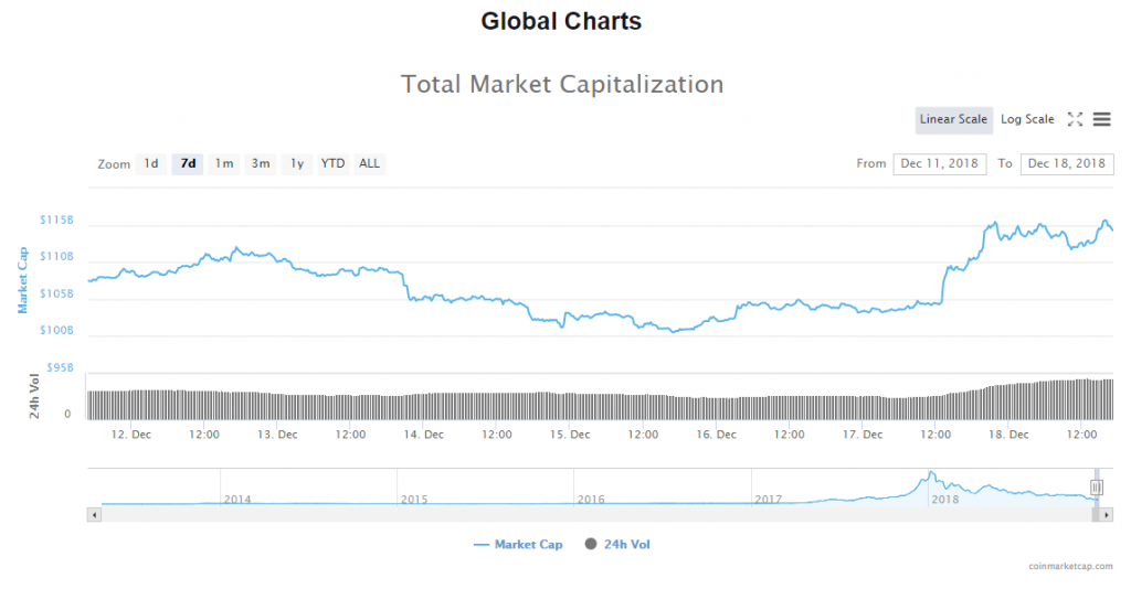 On yesterday’s open the evaluation of the cryptocurrency market cap was at around $103,370,883,000. From there the evaluation has increased to $115,442,000,000 at its highest point. From there the evaluation has retreated slightly and has fallen today to around $111,720,805,000 which was the lowest point so far as the evaluation again started increasing from there and is now around the same levels as on yesterday’s high.